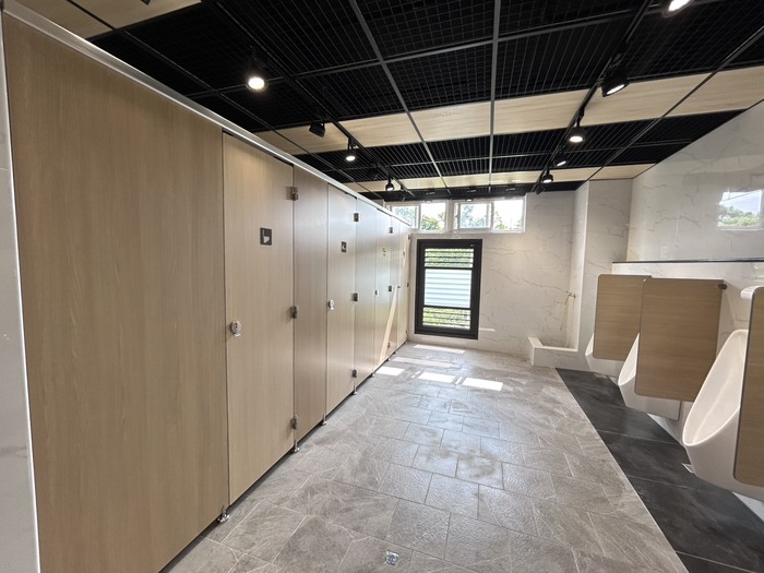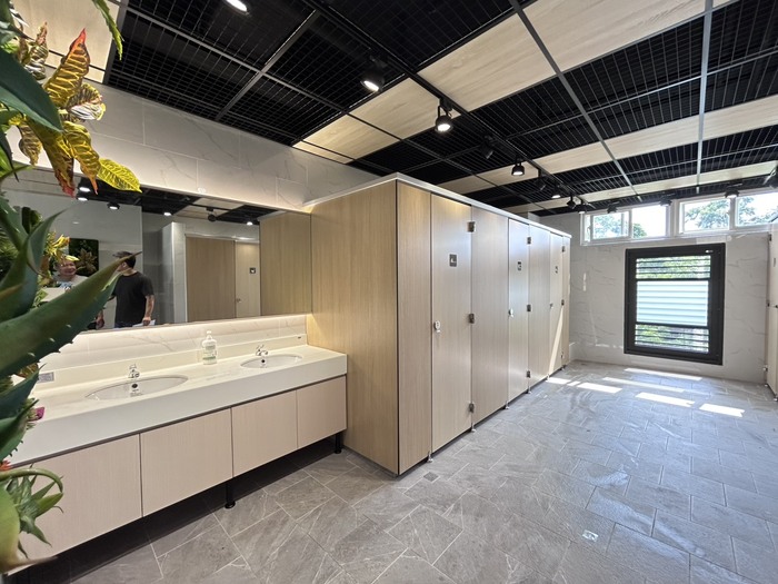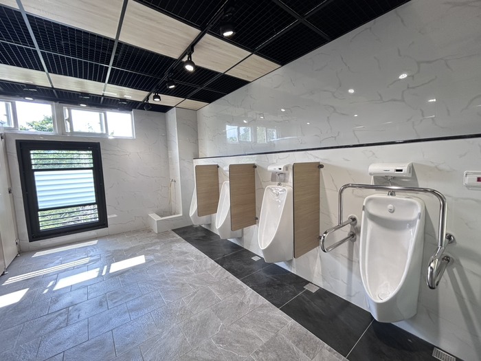 本次整修工程以「明亮、通風、無障礙、綠意、現代感」為設計理念,從牆面到天花板皆採用防潮易清潔建材,並配置節能照明與大面積自然採光設計,讓空間更乾淨明亮。