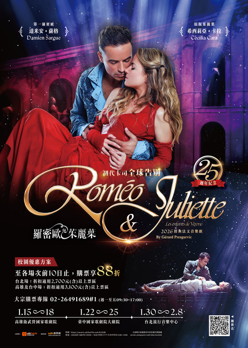 一、 經典法文音樂劇《羅密歐與茱麗葉》自2001年在巴黎首演即轟動全球,以磅礴動人的音樂、現代感十足的編舞與都市巴洛克風格美學,重新詮釋莎士比亞經典悲劇,劇中更以紅與藍兩大色系象徵家族對峙,展現強烈視覺張力;而初代卡司的演出早已成為大眾心中難以取代的記憶,本次適逢音樂劇25周年同時也是初代卡司告別巡演,讓這次在台灣的演出更具紀念性。法文音樂劇以獨樹一格的「演唱會」形式製作打造,特別強調「音樂」與「演員魅力」,以「歌」帶「戲」是法式音樂劇製作的順序與模式,藉由歌曲詠唱以及雋永詞彙的表達,再加上多樣化背景音樂襯托,讓演員的情緒起伏及情感傳遞更加深刻。誠摯推薦師生前來觀賞國際級精彩演出,並藉此增進對各類表演類型的了解。