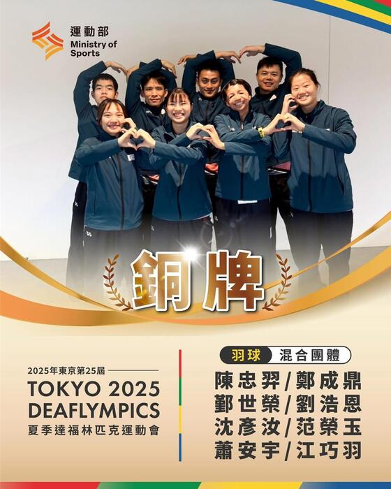 蘇淵源說,從2018年江巧羽在亞太聽障錦標賽奪金,到2025年蕭安宇與江巧羽在東京聽奧聯手奪銅,這是一場完美的「世代傳承」。