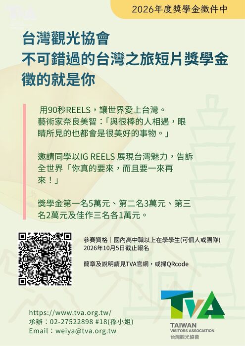 轉知:2026年財團法人台灣觀光協會2026年度「不可錯過的台灣之旅短片獎學金」簡章及海報,詳見附件。